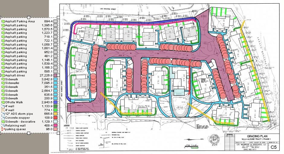 Earthwork Take-off - We can provide a detailed take-off of the earthwork from the engineered grading plans, showing the site areas with cuts and fills. This can be used to analyze the grading design in order to reach a balanced site. It also gives you the quantities when negotiating with the grading contractors. The quantities are shown in an Excel formatted spreadsheet with screen shots emailed to you. These are some examples of the take-off "screen shots". Digitized Site Plan - Brown Shades are Existing Grades, Blue Shades are Paving Subgrades